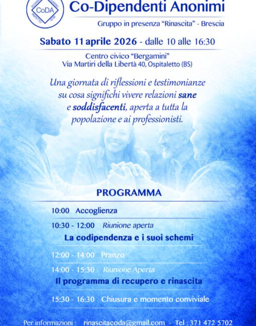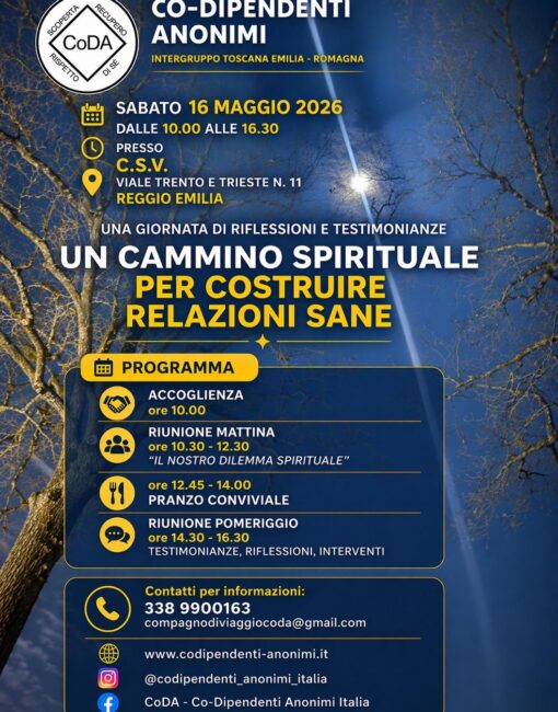 Vi diamo il benvenuto a Co-Dipendenti Anonimi, un Programma di recupero dalla codipendenza in cui ognuno di noi può condividere esperienza, forza e …
