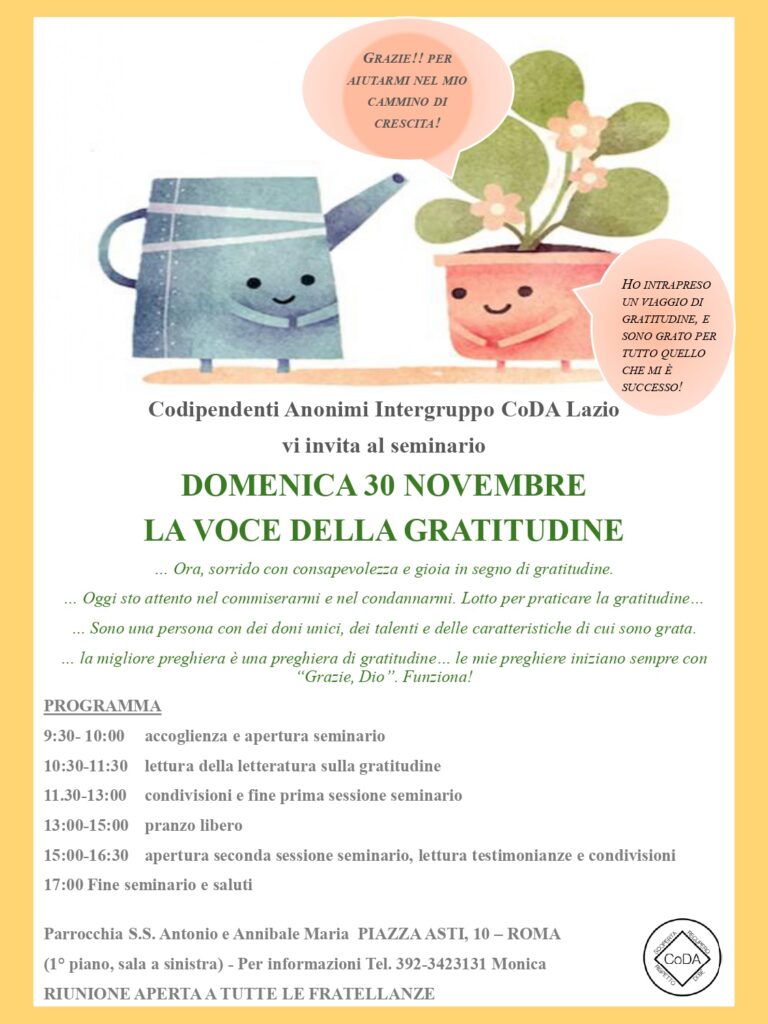 Il chiedermi come faccio è già un progresso, un passo nella direzione sia del desiderio che della speranza di una possibilità; e questo ha portato ad ulteriori studi, approfondimenti e riflessioni, oltre al proseguimento della partecipazione al gruppo e al desiderio di continuare nel Programma CoDA.